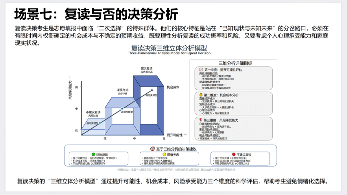 - 场景七:复读与否的决策分析。三维立体分析模型与核心需求。