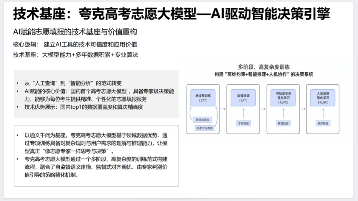- 技术基座:夸克高考志愿大模型AI驱动智能决策引擎。AI赋能志愿填报的技术逻辑与优势。