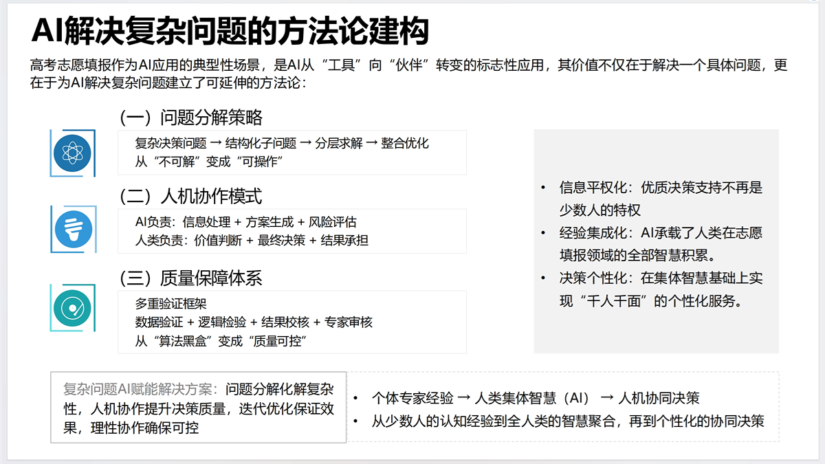 - 人机协同的决策模式:在高考志愿填报中,人始终是决策的主体,需要综合考虑国家发展需要、社会现实需求和个人天赋特长。